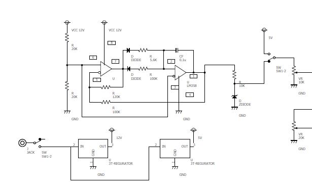 VCOは5V用なのでOP-AMPの出力に10K+VR(10KΩ)を接続し過電圧保護用に